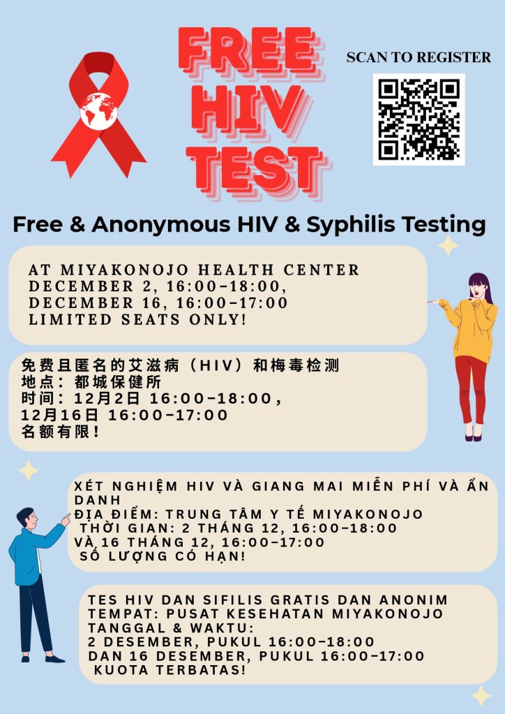 免费且匿名的艾滋病(H I V)和梅毒检测 地点:都城保健所