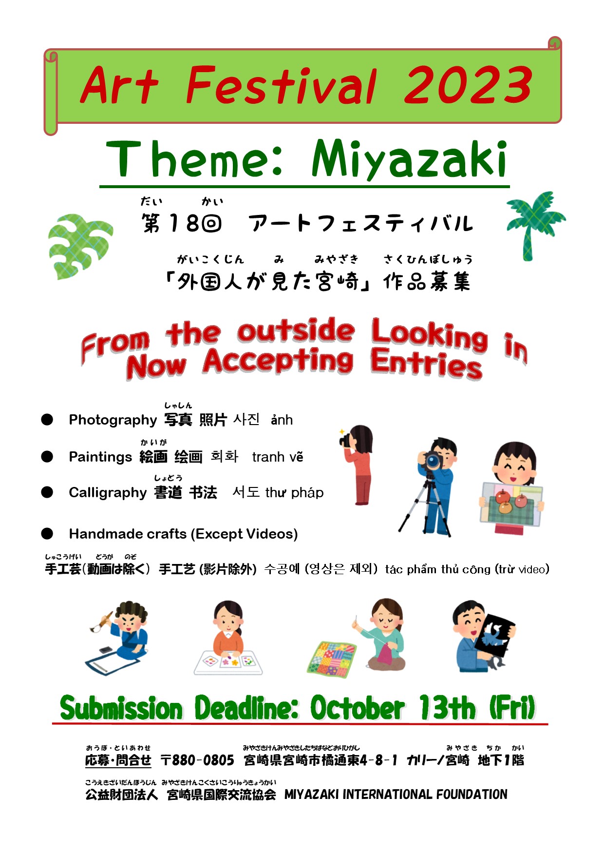 第18届艺术节2023.7.26 第18届艺术节 2023.11.1 10:00 上午 – 2023.11.2 7:00 下午 Carino宫崎 地下一楼 宫崎国际PLAZA第18届艺术节 「外国人眼里的宫崎」作品展 作品募集♪ 【主题】「宫崎」 Read more View full calendar