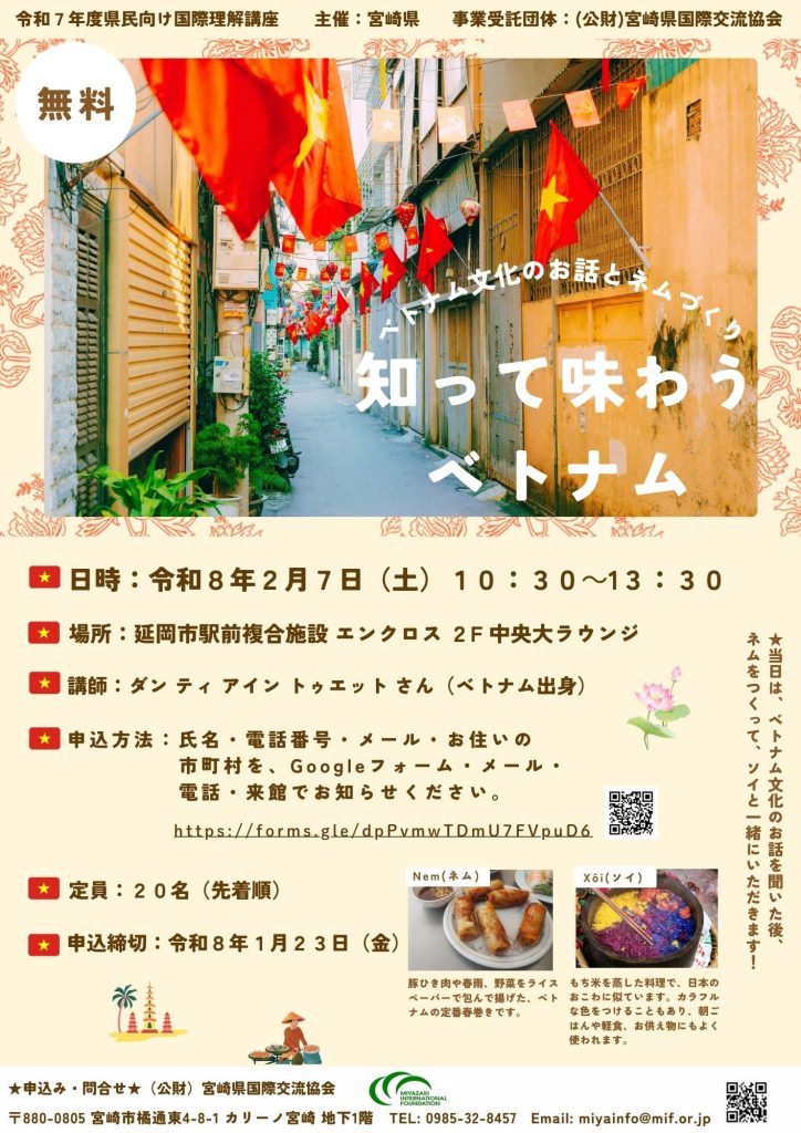 ベトナム出身のダンさんを講師に迎え、ベトナム文化についてお話をしていただきます。お話の後は、ひき肉や春雨、野菜をライスペーパーで包んで揚げたベトナムの定番春巻き「ネム」を作りましょう!